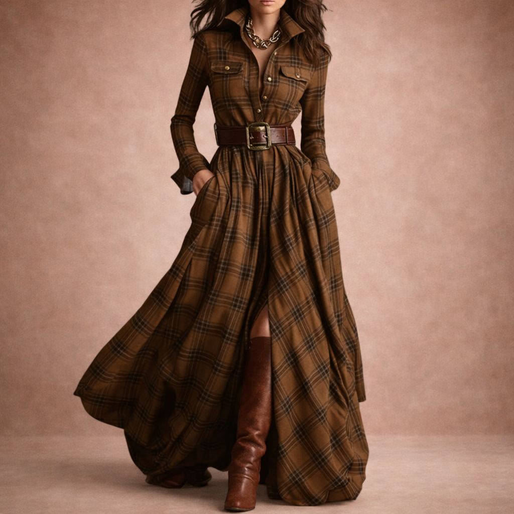 The Barboteau™ dress combines rustic charm with refined elegance. Made from a soft, flowing fabric in rich autumnal tones, it features a tailored shirt-style bodice and a wide, flowing skirt that moves beautifully with every step. The coordinating belt defines the waist, creating a naturally feminine silhouette, perfect for any season.